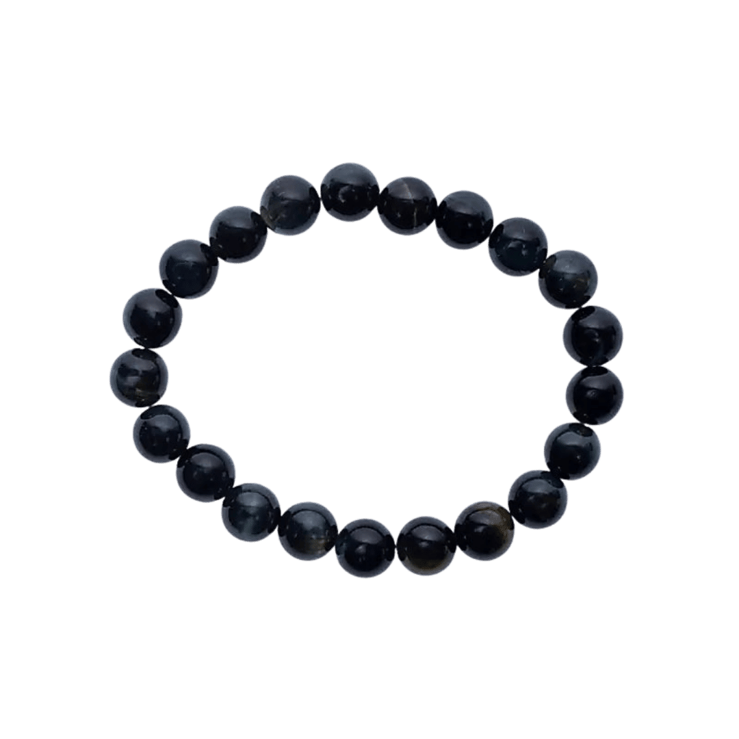 Dette elastiske armbånd er skabt af glatte perler i blå tigerøje, også kendt som falcon’s eye eller hawk’s eye. Stenen fremstår i smukke blålige og mørke nuancer med en silkeagtig glans, som fanger lyset på fortryllende vis. Armbåndet er strækbart og sidder komfortabelt på de fleste håndled, hvilket gør det til et både stilrent og energifyldt smykke.