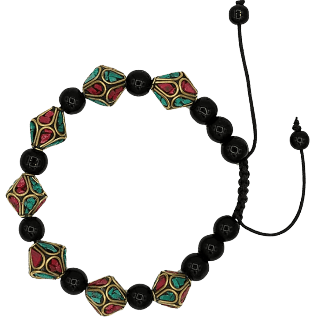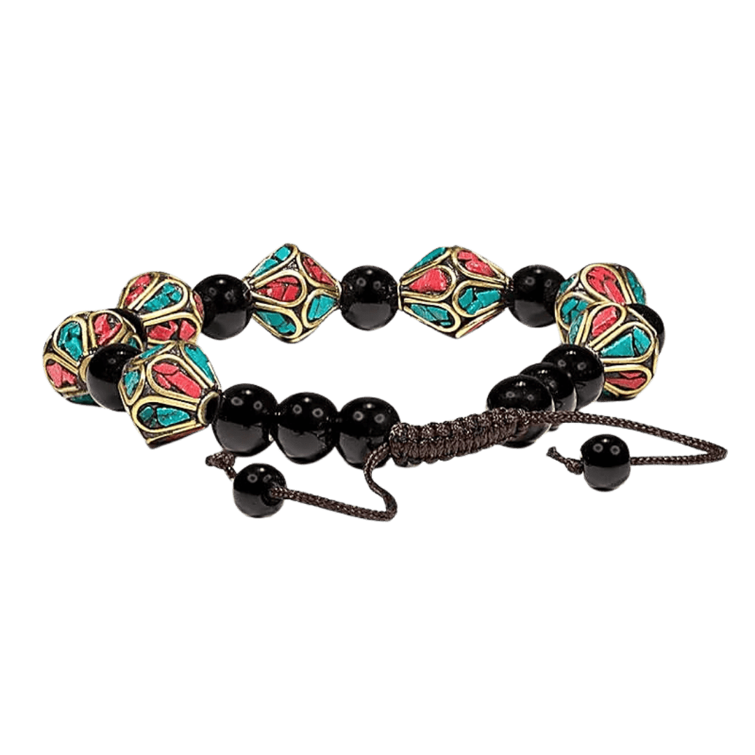 Dette smukke justerbare armbånd kombinerer tre kraftfulde materialer: turkis (paste), nepalesisk bjergkoraller og sort agat. Sammen skaber de et farverigt og energetisk smykke, som ikke blot pryder dit håndled, men også tilfører spirituel styrke og indre ro.