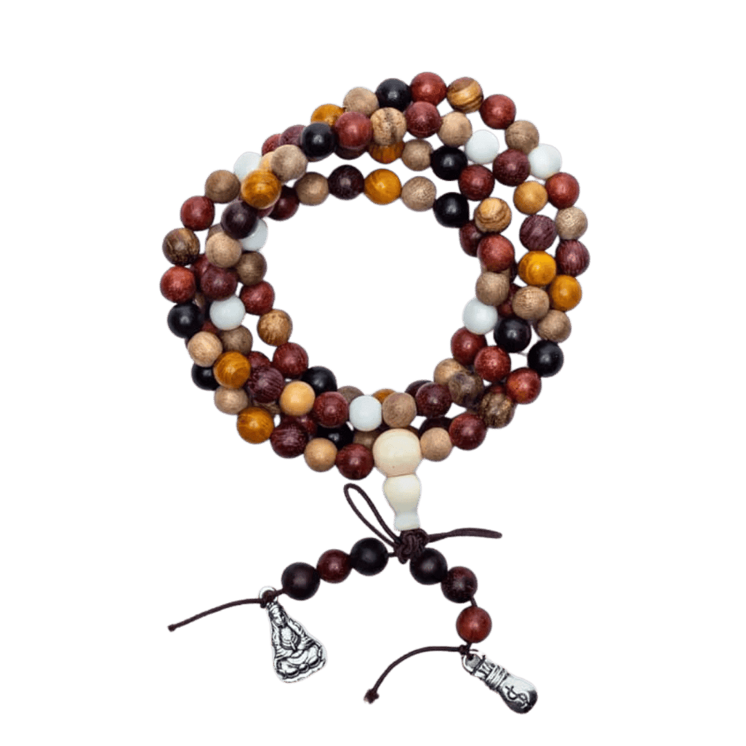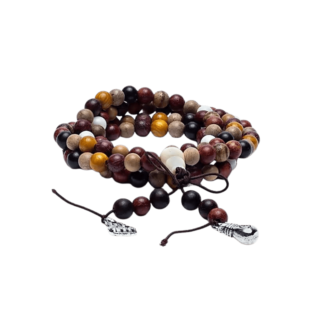 Hver træsort i denne eksklusive mala bidrager med sin egen unikke energi og spirituelle egenskaber, der tilsammen skaber et kraftfuldt redskab til din meditative praksis.