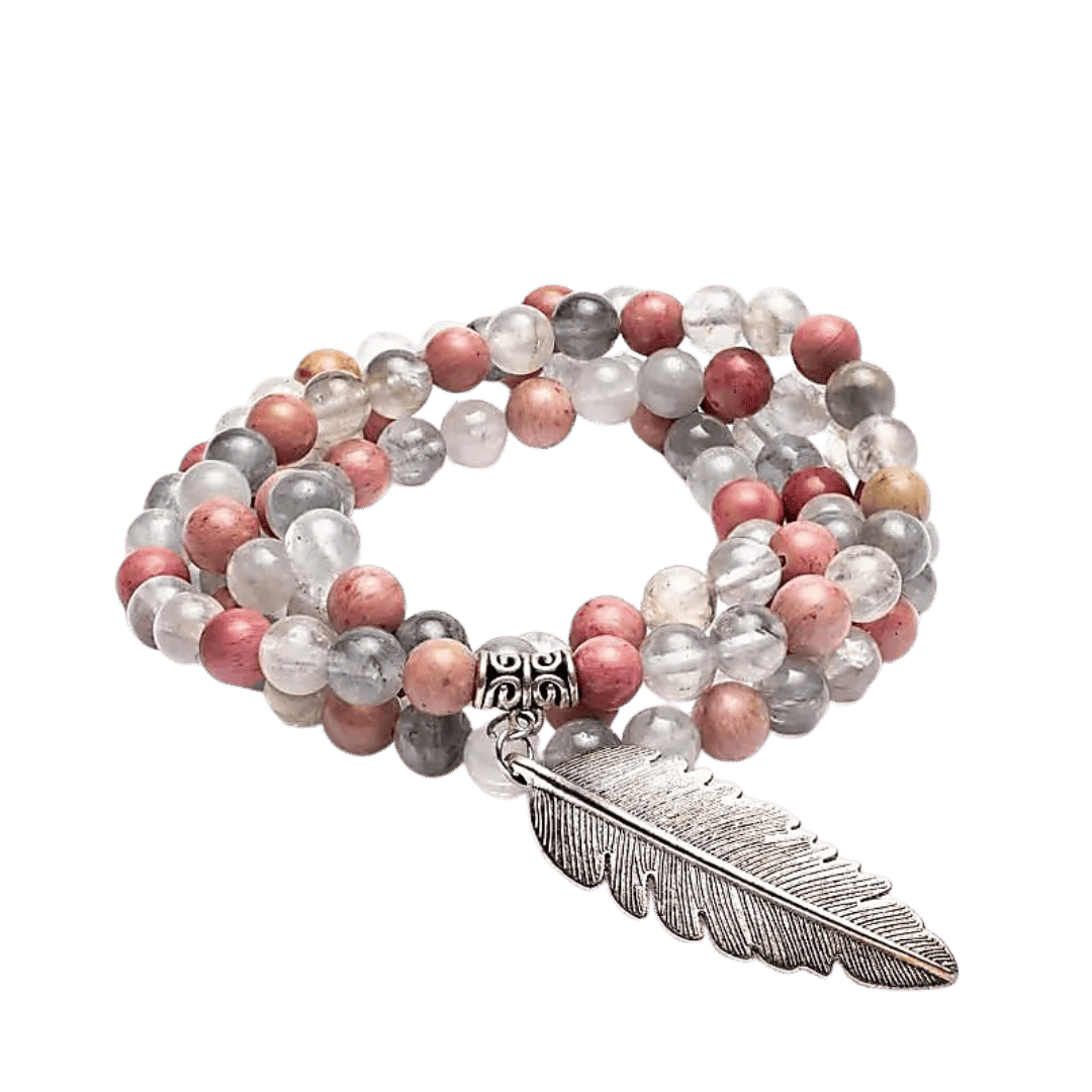 Rhodonit & Grå Kvarts Mala – Med Fjersymbol og 108 Perler