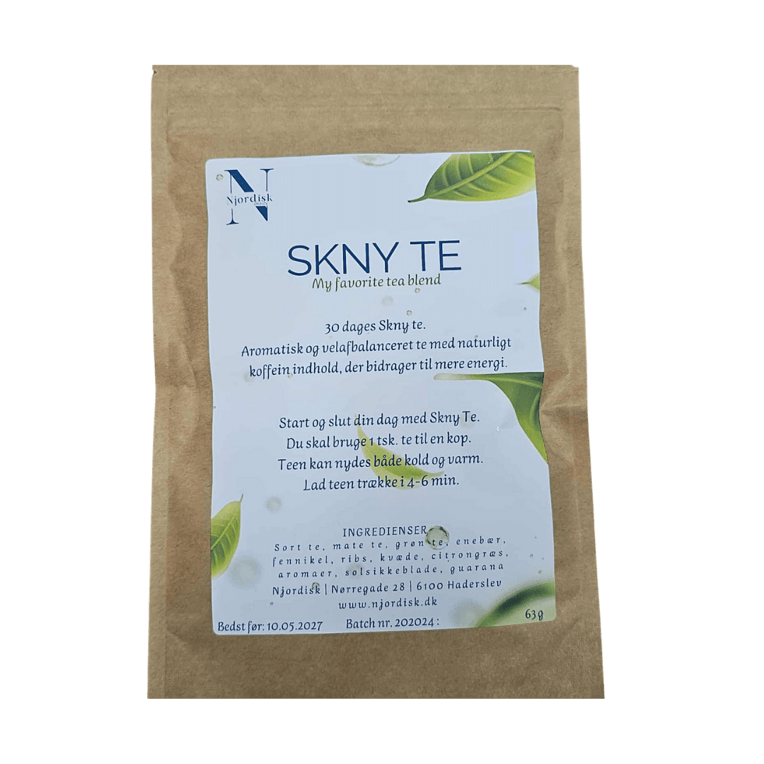 Vores veganske Skny te kombinerer 10 udvalgte aktive botaniske ingredienser. Hver enkelt element i denne te er valgt med omhu: Grøn te kendt for sin friske profil, Maté te med sin karakteristiske smag, Sort te med sin dybe note, energiske Guarana, aromatisk Fennikel, skovagtige Enebær, syrlige Ribs, milde Solsikkeblade, frugtige Kvæde og eksotisk Citrongræs.